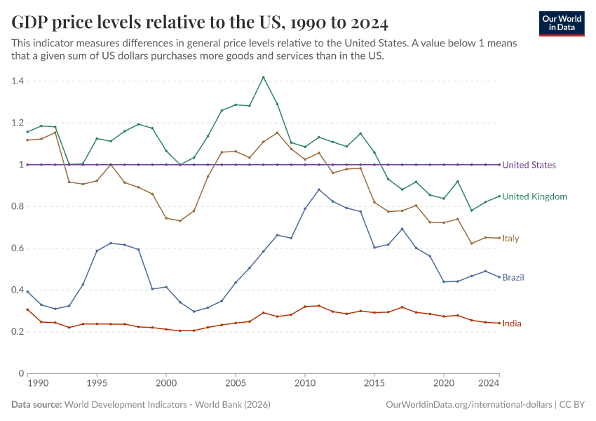 World Development Indicators - World Bank (2025) – processed by Our World in Data. “GDP price levels relative to the US – World Bank” [dataset]. World Development Indicators - World Bank, “World Development Indicators 122” [original data]. Retrieved December 29, 2025 from https://data-forest-share-update.owid.pages.dev:8789/20250916-100934/grapher/gdp-price-levels-relative-to-the-us.html (archived on September 16, 2025).