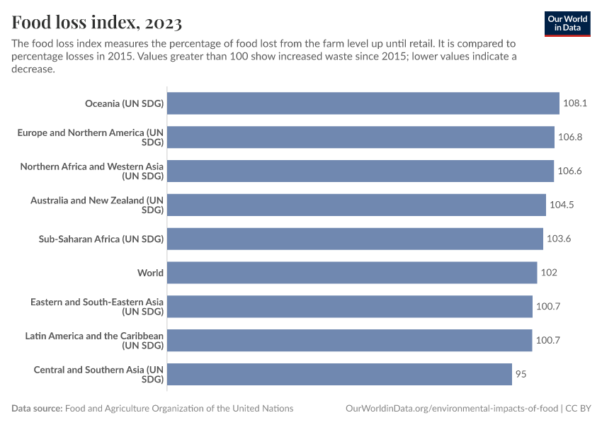 Food and Agriculture Organization of the United Nations – processed by Our World in Data. “Food loss index” [dataset]. Food and Agriculture Organization of the United Nations, “FAO” [original data]. Retrieved December 29, 2025 from https://data-forest-share-update.owid.pages.dev:8789/20251125-165536/grapher/global-food-loss-index.html (archived on November 25, 2025).