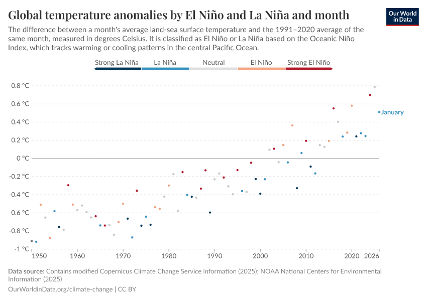 “Data Page: Global temperature anomalies by El Niño and La Niña and month”, part of the following publication: Hannah Ritchie, Pablo Rosado, and Veronika Samborska (2024) - “Climate Change”. Data adapted from Contains modified Copernicus Climate Change Service information. Retrieved from https://data-forest-share-update.owid.pages.dev:8789/20251210-141710/grapher/global-temperature-anomalies-by-el-nino-la-nina-and-month.html [online resource] (archived on December 10, 2025).How to cite this data