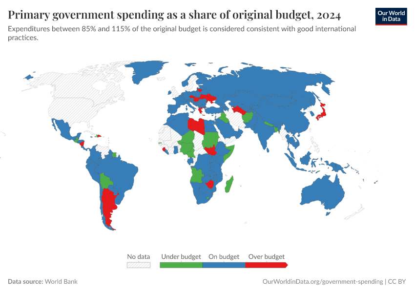 “Data Page: Primary government spending as a share of original budget”. Our World in Data (2025). Data adapted from World Bank. Retrieved from https://data-forest-share-update.owid.pages.dev:8789/20251120-211749/grapher/govt-expenditure-share-budget.html [online resource] (archived on November 20, 2025).How to cite this data