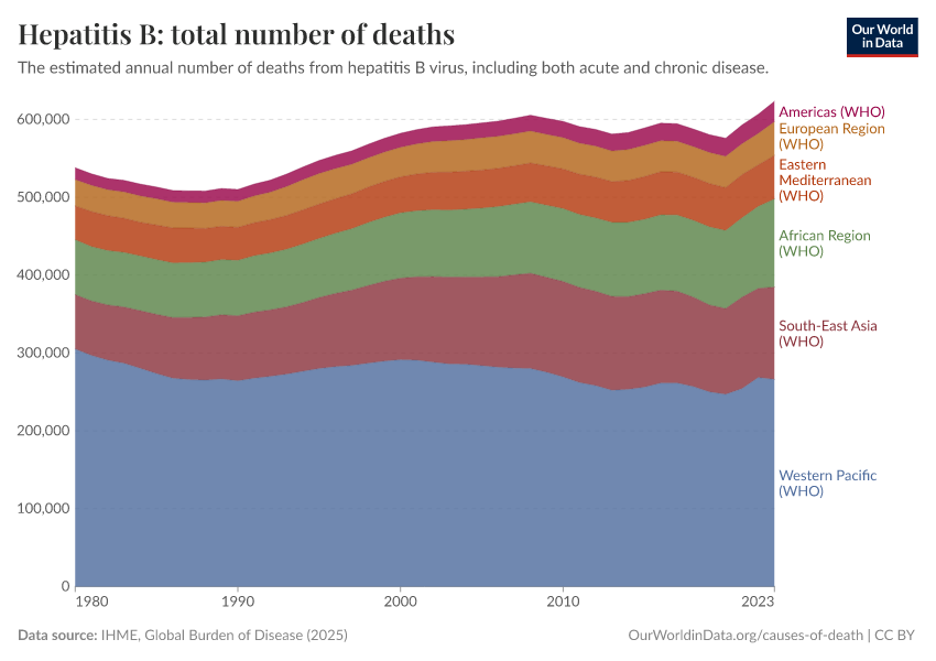 “Data Page: Hepatitis B: total number of deaths”, part of the following publication: Esteban Ortiz-Ospina and Max Roser (2016) - “Global Health”. Data adapted from IHME, Global Burden of Disease. Retrieved from https://data-forest-share-update.owid.pages.dev:8789/20250909-093708/grapher/hepatitis-b-number-of-deaths.html [online resource] (archived on September 9, 2025).How to cite this data