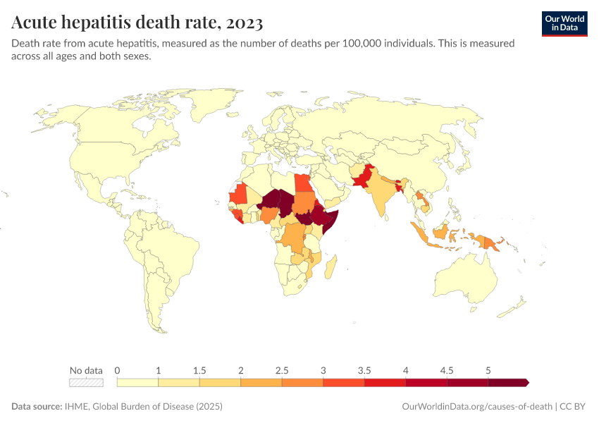 IHME, Global Burden of Disease (2024) – with minor processing by Our World in Data. “Acute hepatitis death rate” [dataset]. IHME, Global Burden of Disease, “Global Burden of Disease - Deaths and DALYs” [original data]. Retrieved December 29, 2025 from https://data-forest-share-update.owid.pages.dev:8789/20250909-093708/grapher/hepatitis-death-rate.html (archived on September 9, 2025).