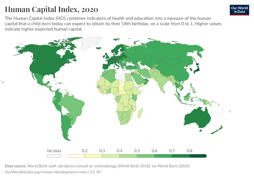 “Data Page: Human Capital Index”. Our World in Data (2025). Data adapted from World Bank staff calculations based on methodology (World Bank 2018), via World Bank. Retrieved from https://data-forest-share-update.owid.pages.dev:8789/20251209-133038/grapher/human-capital-index-in-2018.html [online resource] (archived on December 9, 2025).How to cite this data