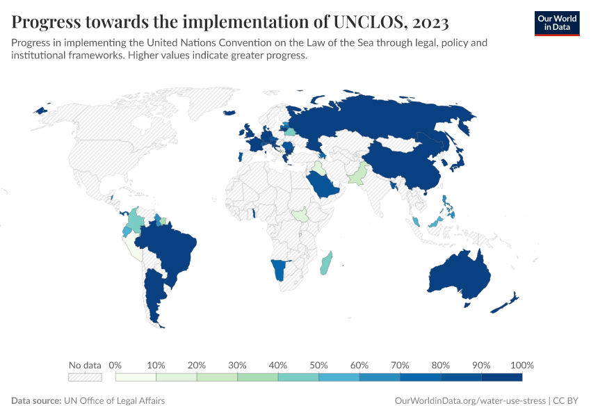 “Data Page: Progress towards the implementation of UNCLOS”. Our World in Data (2025). Data adapted from UN Office of Legal Affairs. Retrieved from https://data-forest-share-update.owid.pages.dev:8789/20251120-211749/grapher/implementation-of-unclos.html [online resource] (archived on November 20, 2025).How to cite this data