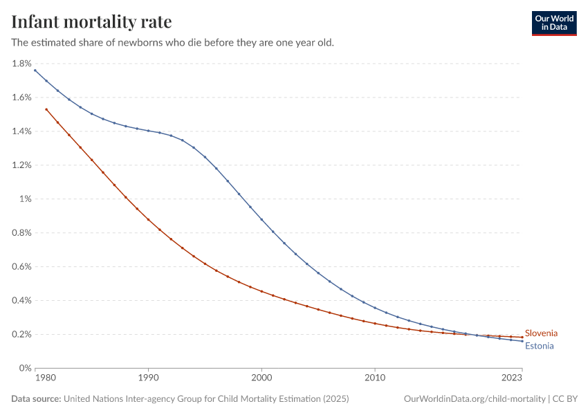 United Nations Inter-agency Group for Child Mortality Estimation (2025) – with major processing by Our World in Data. “Infant mortality rate” [dataset]. United Nations Inter-agency Group for Child Mortality Estimation, “United Nations Inter-agency Group for Child Mortality Estimation”; Various sources, “Population” [original data]. Retrieved December 29, 2025 from https://data-forest-share-update.owid.pages.dev:8789/20250925-233948/grapher/infant-mortality.html (archived on September 25, 2025).