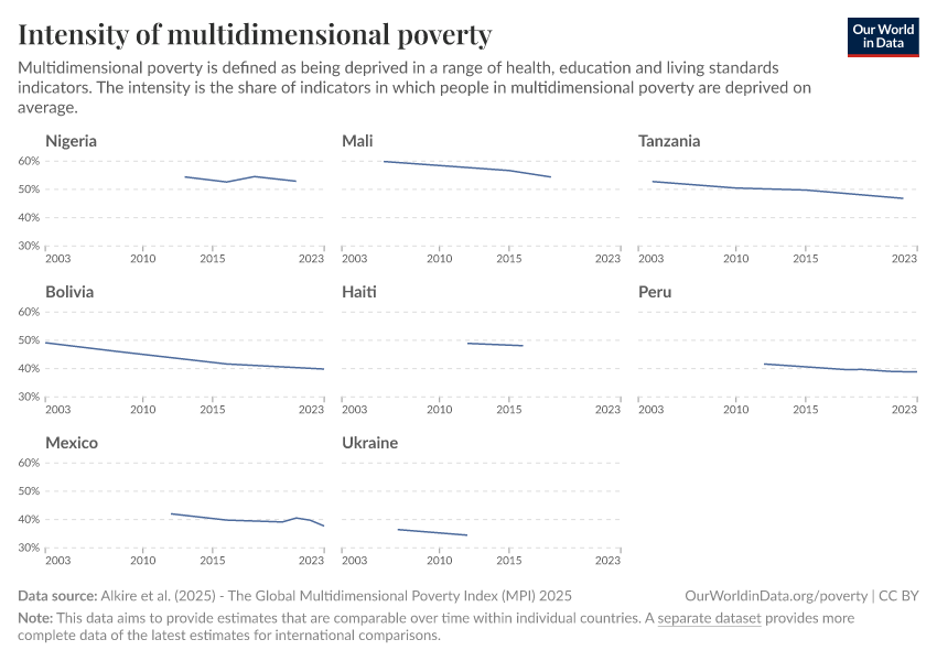 Alkire, Kanagaratnam and Suppa (2024) - The Global Multidimensional Poverty Index (MPI) 2024 – with minor processing by Our World in Data. “Intensity of multidimensional poverty – Harmonized over time” [dataset]. Alkire, Kanagaratnam and Suppa, “Global Multidimensional Poverty Index (MPI) 2024” [original data]. Retrieved December 29, 2025 from https://data-forest-share-update.owid.pages.dev:8789/20250909-093708/grapher/intensity-of-multidimensional-poverty-hot.html (archived on September 9, 2025).
