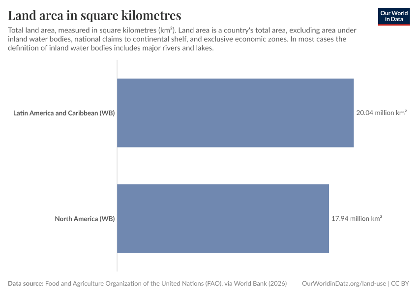 Food and Agriculture Organization of the United Nations (FAO), via World Bank (2025) – processed by Our World in Data. “Land area in square kilometres” [dataset]. Food and Agriculture Organization of the United Nations (FAO), via World Bank, “World Development Indicators 122” [original data]. Retrieved December 29, 2025 from https://data-forest-share-update.owid.pages.dev:8789/20250916-102301/grapher/land-area-km.html (archived on September 16, 2025).