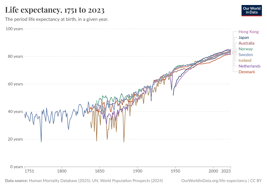 “Data Page: Life expectancy at birth”, part of the following publication: Saloni Dattani, Lucas Rodés-Guirao, Hannah Ritchie, Esteban Ortiz-Ospina, and Max Roser (2023) - “Life Expectancy”. Data adapted from Human Mortality Database, United Nations. Retrieved from https://data-forest-share-update.owid.pages.dev:8789/20251022-222946/grapher/life-expectancy-hmd-unwpp.html [online resource] (archived on October 22, 2025).How to cite this data