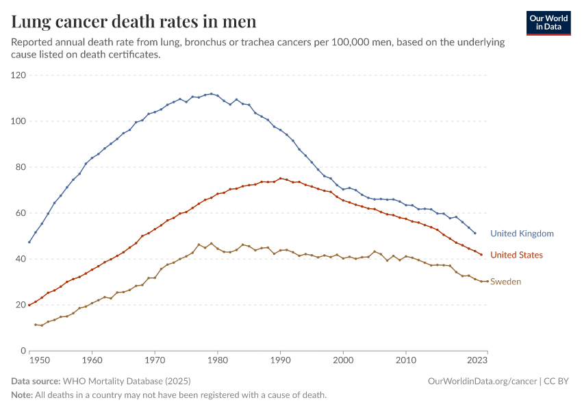 “Data Page: Lung cancer death rates in men”, part of the following publication: Saloni Dattani, Fiona Spooner, Hannah Ritchie, and Max Roser (2023) - “Causes of Death”. Data adapted from WHO Mortality Database. Retrieved from https://data-forest-share-update.owid.pages.dev:8789/20250909-093708/grapher/lung-cancer-death-rates-males.html [online resource] (archived on September 9, 2025).How to cite this data