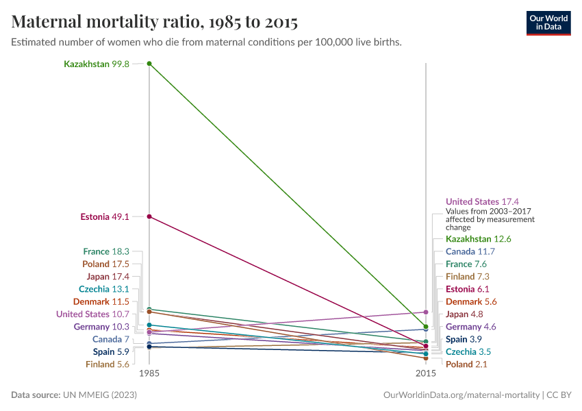 UN MMEIG (2023) – processed by Our World in Data. “Maternal mortality ratio” [dataset]. UN MMEIG (WHO, UNICEF, UNFPA, World Bank Group and UNDESA/ Population Division), “Trends in maternal mortality 2020” [original data]. Retrieved December 29, 2025 from https://data-forest-share-update.owid.pages.dev:8789/20251202-123029/grapher/maternal-mortality-slope-chart.html (archived on December 2, 2025).