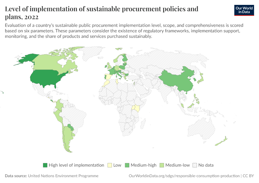 “Data Page: Level of implementation of sustainable procurement policies and plans”. Our World in Data (2025). Data adapted from United Nations Environment Programme. Retrieved from https://data-forest-share-update.owid.pages.dev:8789/20251120-211749/grapher/medium-high-level-implementation-of-sustainable-public-procurement.html [online resource] (archived on November 20, 2025).How to cite this data