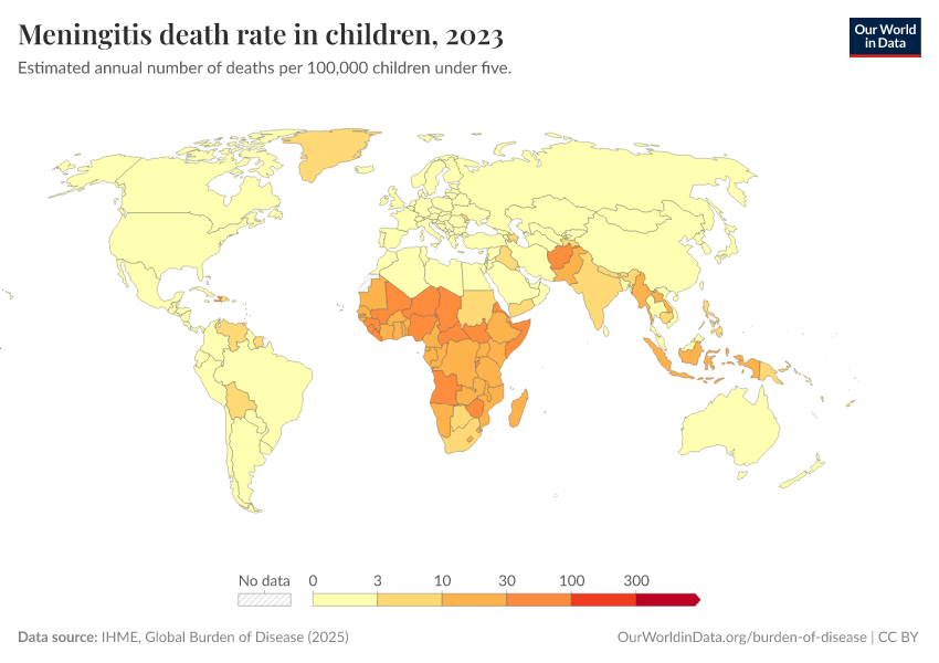 IHME, Global Burden of Disease (2024) – with minor processing by Our World in Data. “Meningitis death rate in children” [dataset]. IHME, Global Burden of Disease, “Global Burden of Disease - Deaths and DALYs” [original data]. Retrieved December 29, 2025 from https://data-forest-share-update.owid.pages.dev:8789/20250909-093708/grapher/meningitis-death-rates-children-under-5.html (archived on September 9, 2025).