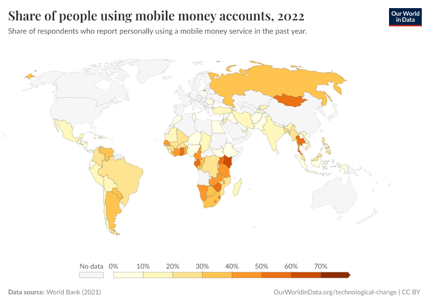 “Data Page: Share of people using mobile money accounts”, part of the following publication: Max Roser, Bertha Rohenkohl, Pablo Arriagada, Joe Hasell, Hannah Ritchie, and Esteban Ortiz-Ospina (2023) - “Economic Growth”. Data adapted from World Bank. Retrieved from https://data-forest-share-update.owid.pages.dev:8789/20250909-093708/grapher/mobile-money-account-usage.html [online resource] (archived on September 9, 2025).How to cite this data