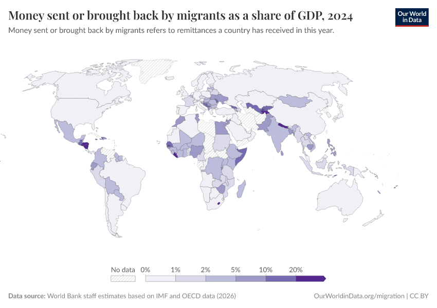 “Data Page: Money sent or brought back by migrants as a share of GDP”. Our World in Data (2025). Data adapted from World Bank staff estimates based on IMF and OECD data. Retrieved from https://data-forest-share-update.owid.pages.dev:8789/20250916-103535/grapher/money-sent-or-brought-back-by-migrants-as-a-share-of-gdp.html [online resource] (archived on September 16, 2025).