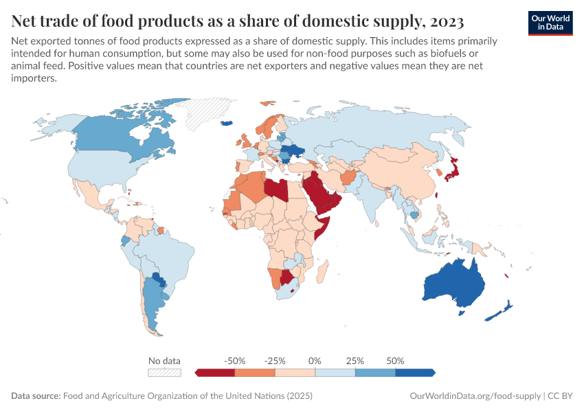 Food and Agriculture Organization of the United Nations (2024) – with major processing by Our World in Data. “Net trade of food products as a share of domestic supply – FAO” [dataset]. Food and Agriculture Organization of the United Nations, “Food Balances: Food Balances (-2013, old methodology and population)”; Food and Agriculture Organization of the United Nations, “Food Balances: Food Balances (2010-)” [original data]. Retrieved December 29, 2025 from https://data-forest-share-update.owid.pages.dev:8789/20251014-163147/grapher/net-food-trade-as-a-share-of-domestic-supply.html (archived on October 14, 2025).