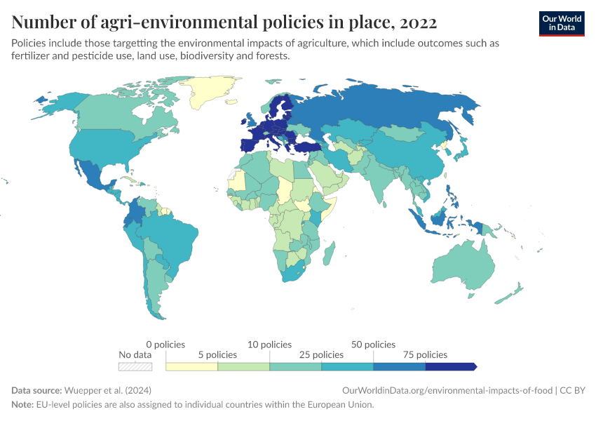 “Data Page: Number of agri-environmental policies in place”. Our World in Data (2025). Data adapted from Wuepper et al. (2024). Retrieved from https://data-forest-share-update.owid.pages.dev:8789/20250909-093708/grapher/number-agri-environmental-policies.html [online resource] (archived on September 9, 2025).How to cite this data
