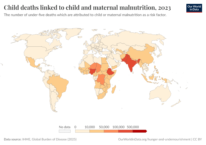 IHME, Global Burden of Disease (2024) – with minor processing by Our World in Data. “Child deaths linked to child and maternal malnutrition” [dataset]. IHME, Global Burden of Disease, “Global Burden of Disease - Risk Factors” [original data]. Retrieved December 29, 2025 from https://data-forest-share-update.owid.pages.dev:8789/20250909-093708/grapher/number-child-deaths-malnutrition.html (archived on September 9, 2025).