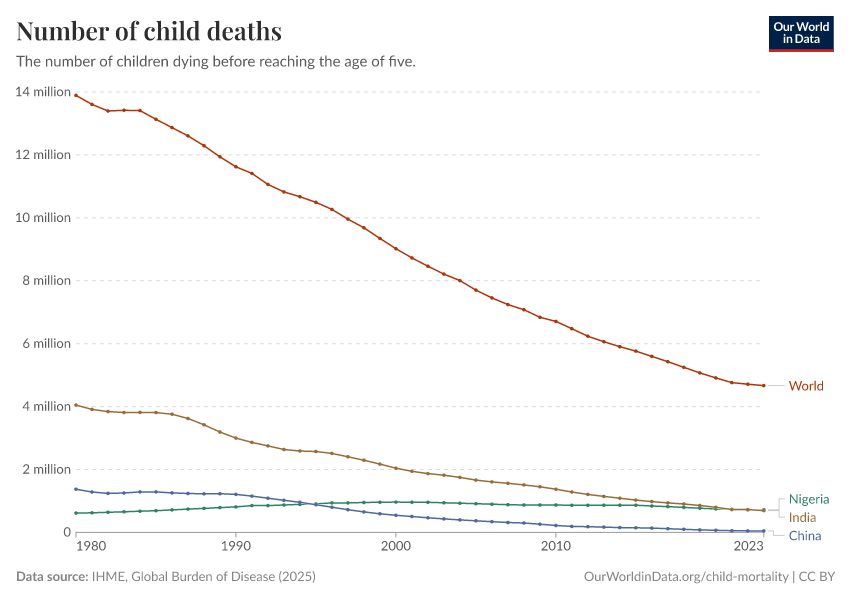 IHME, Global Burden of Disease (2024) – with minor processing by Our World in Data. “Number of child deaths” [dataset]. IHME, Global Burden of Disease, “Global Burden of Disease - Deaths and DALYs” [original data]. Retrieved December 29, 2025 from https://data-forest-share-update.owid.pages.dev:8789/20250909-093708/grapher/number-of-child-deaths.html (archived on September 9, 2025).