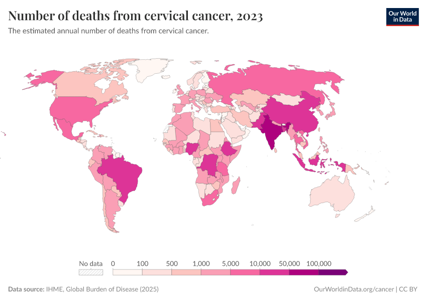 “Data Page: Number of deaths from cervical cancer”, part of the following publication: Esteban Ortiz-Ospina and Max Roser (2016) - “Global Health”. Data adapted from IHME, Global Burden of Disease. Retrieved from https://data-forest-share-update.owid.pages.dev:8789/20250909-093708/grapher/number-of-deaths-from-cervical-cancer.html [online resource] (archived on September 9, 2025).How to cite this data