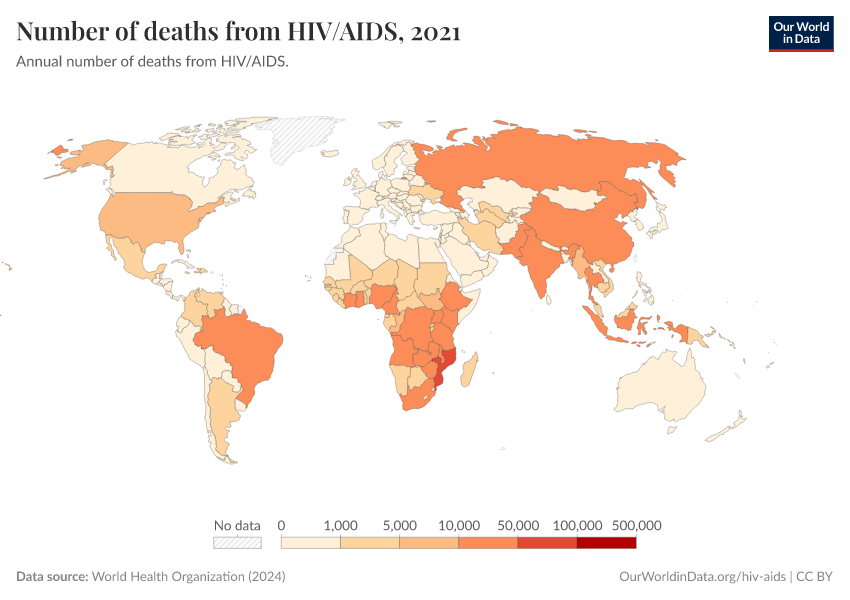 World Health Organization (2024) – with major processing by Our World in Data. “Number of deaths from HIV/AIDS” [dataset]. World Health Organization, “Global Health Estimates” [original data]. Retrieved December 29, 2025 from https://data-forest-share-update.owid.pages.dev:8789/20250909-093708/grapher/number-of-deaths-from-hivaids-who.html (archived on September 9, 2025).
