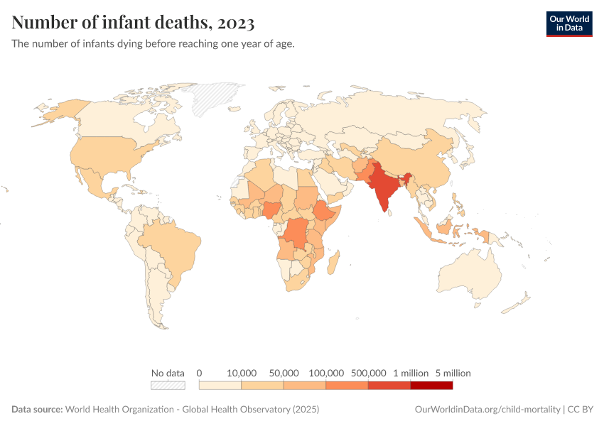 “Data Page: Number of infant deaths”. Our World in Data (2025). Data adapted from World Health Organization. Retrieved from https://data-forest-share-update.owid.pages.dev:8789/20250909-093708/grapher/number-of-infant-deaths-gho.html [online resource] (archived on September 9, 2025).How to cite this data