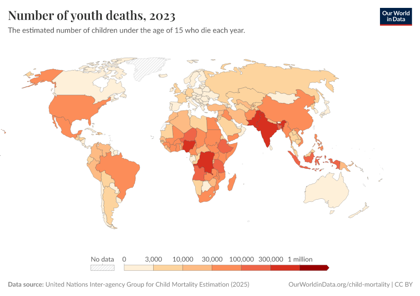 United Nations Inter-agency Group for Child Mortality Estimation (2025) – with major processing by Our World in Data. “Under-fifteen deaths” [dataset]. United Nations Inter-agency Group for Child Mortality Estimation, “United Nations Inter-agency Group for Child Mortality Estimation”; UN Inter-agency Group for Child Mortality Estimation, “Child Mortality Estimates 2018”; Various sources, “Population” [original data]. Retrieved December 29, 2025 from https://data-forest-share-update.owid.pages.dev:8789/20250923-095526/grapher/number-of-youth-deaths.html (archived on September 23, 2025).