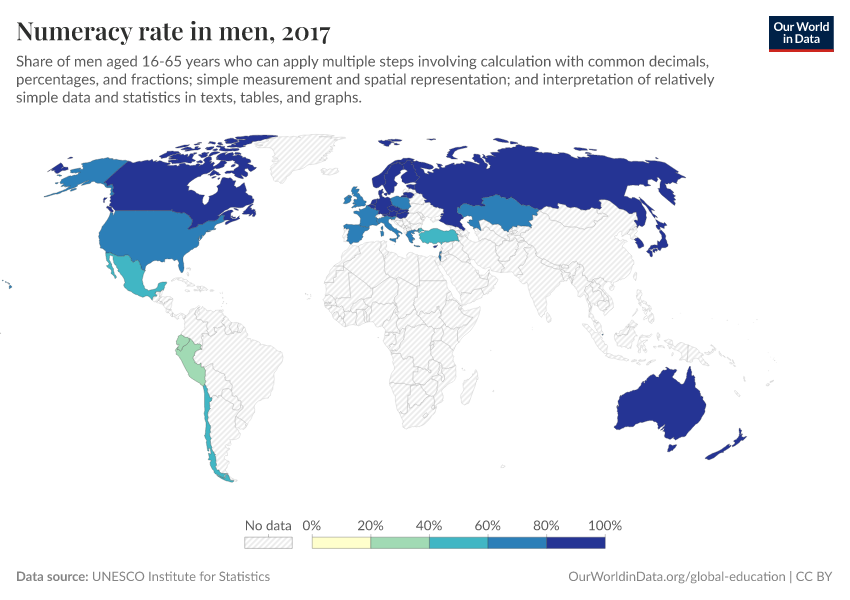“Data Page: Numeracy rate in men”. Our World in Data (2025). Data adapted from UNESCO Institute for Statistics. Retrieved from https://data-forest-share-update.owid.pages.dev:8789/20251120-211749/grapher/numeracy-rate-in-adult-men.html [online resource] (archived on November 20, 2025).How to cite this data