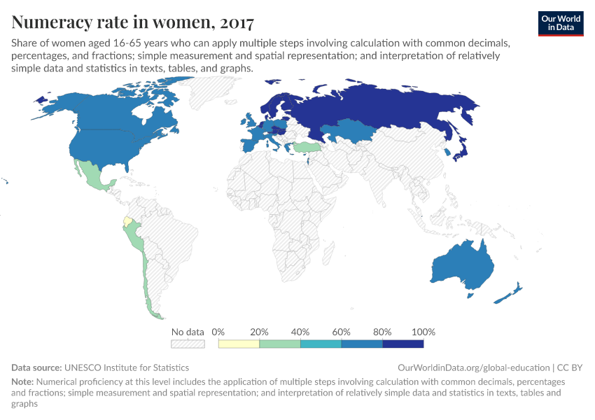 “Data Page: Numeracy rate in women”. Our World in Data (2025). Data adapted from UNESCO Institute for Statistics. Retrieved from https://data-forest-share-update.owid.pages.dev:8789/20251120-211749/grapher/numeracy-rate-in-adult-women-sdg.html [online resource] (archived on November 20, 2025).How to cite this data