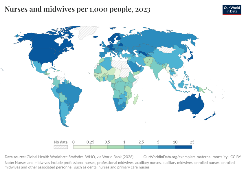 “Data Page: Nurses and midwives per 1,000 people”. Our World in Data (2025). Data adapted from World Health Organization (Global Health Workforce Statistics), OECD, and country data, via World Bank. Retrieved from https://data-forest-share-update.owid.pages.dev:8789/20250916-102301/grapher/nurses-and-midwives-per-1000-people.html [online resource] (archived on September 16, 2025).How to cite this data