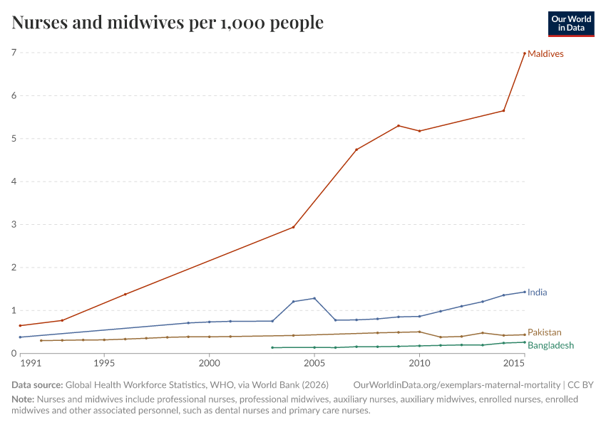 “Data Page: Nurses and midwives per 1,000 people”. Our World in Data (2025). Data adapted from World Health Organization (Global Health Workforce Statistics), OECD, and country data, via World Bank. Retrieved from https://data-forest-share-update.owid.pages.dev:8789/20250916-102301/grapher/nurses-and-midwives-per-1000-people.html [online resource] (archived on September 16, 2025).
