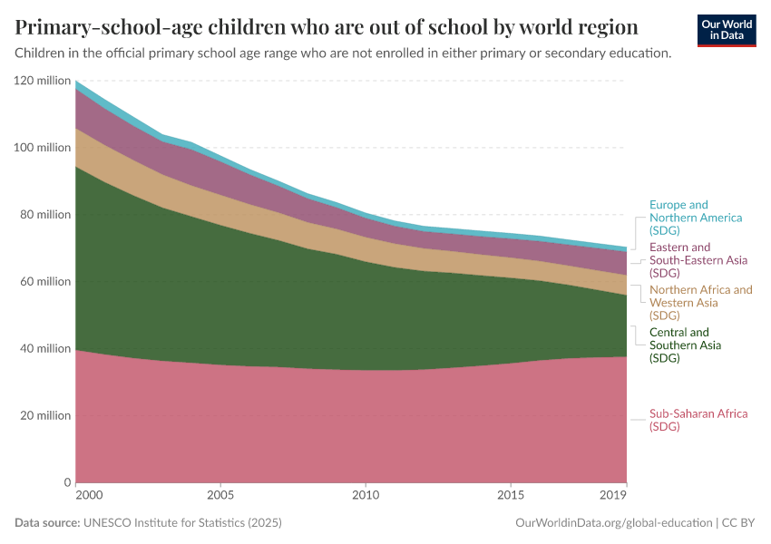 “Data Page: Out-of-school children of primary school age”, part of the following publication: Hannah Ritchie, Veronika Samborska, Natasha Ahuja, Esteban Ortiz-Ospina, and Max Roser (2023) - “Global Education”. Data adapted from UNESCO Institute for Statistics. Retrieved from https://data-forest-share-update.owid.pages.dev:8789/20250909-093708/grapher/out-of-school-children-of-primary-school-age-by-world-region.html [online resource] (archived on September 9, 2025).How to cite this data