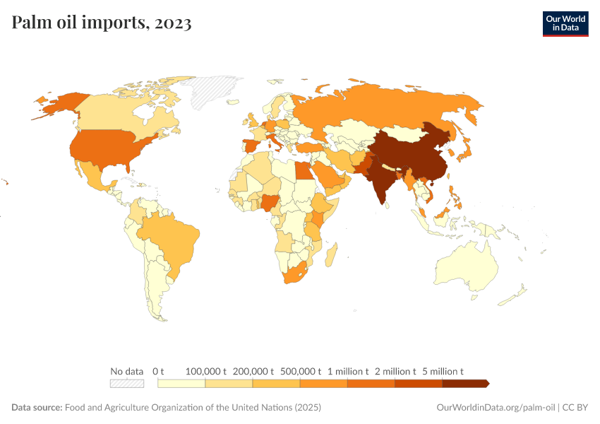 “Data Page: Imports of palm oil”. Our World in Data (2025). Data adapted from Food and Agriculture Organization of the United Nations. Retrieved from https://data-forest-share-update.owid.pages.dev:8789/20251014-163147/grapher/palm-oil-imports.html [online resource] (archived on October 14, 2025).