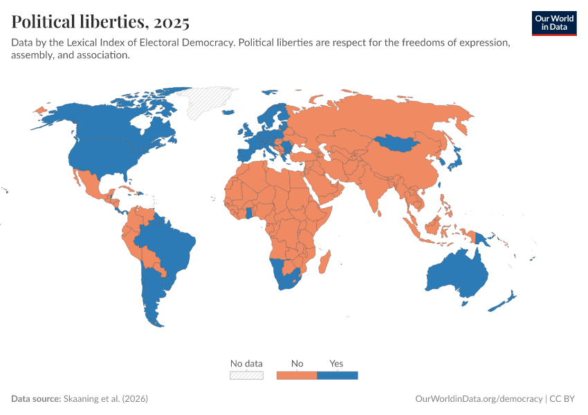 Skaaning et al. (2025) – processed by Our World in Data. “Political liberties” [dataset]. Skaaning et al., “Lexical Index of Electoral Democracy (LIED) v6.8” [original data]. Retrieved December 29, 2025 from https://data-forest-share-update.owid.pages.dev:8789/20250909-093708/grapher/political-liberties-lexical.html (archived on September 9, 2025).