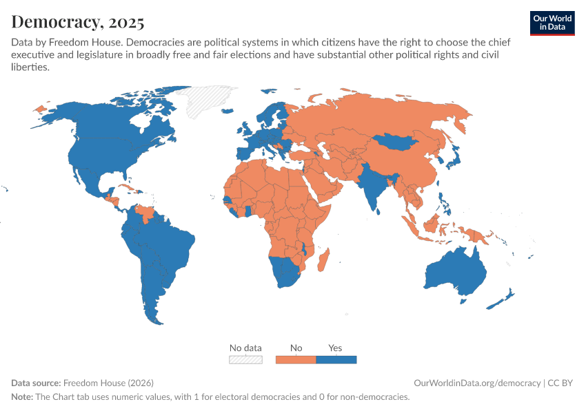 Freedom House (2025) – processed by Our World in Data. “Democracy” [dataset]. Freedom House, “Freedom in the World” [original data]. Retrieved December 29, 2025 from https://data-forest-share-update.owid.pages.dev:8789/20250909-093708/grapher/political-regime-dem-fh.html (archived on September 9, 2025).