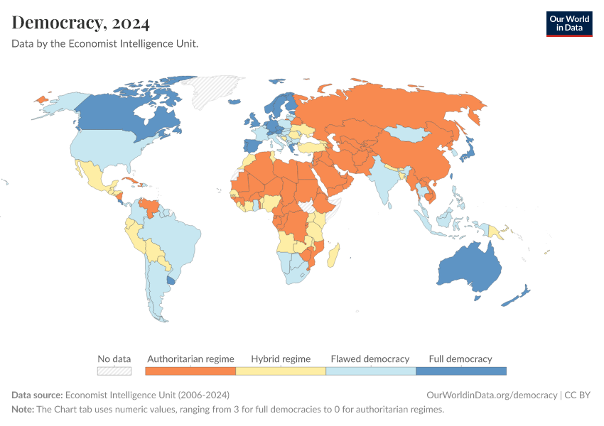 Economist Intelligence Unit (2006-2024) – processed by Our World in Data. “Democracy” [dataset]. Economist Intelligence Unit, “Democracy Index 2021: The China challenge”; Economist Intelligence Unit, “Democracy Index 2022: Frontline democracy and the battle for Ukraine”; Economist Intelligence Unit, “Democracy Index 2023: Age of Conflict”; Economist Intelligence Unit, “Democracy Index 2024: What's wrong with representative democracy?”; Gapminder, “Democracy Index v4” [original data]. Retrieved December 29, 2025 from https://data-forest-share-update.owid.pages.dev:8789/20250909-093708/grapher/political-regime-eiu.html (archived on September 9, 2025).