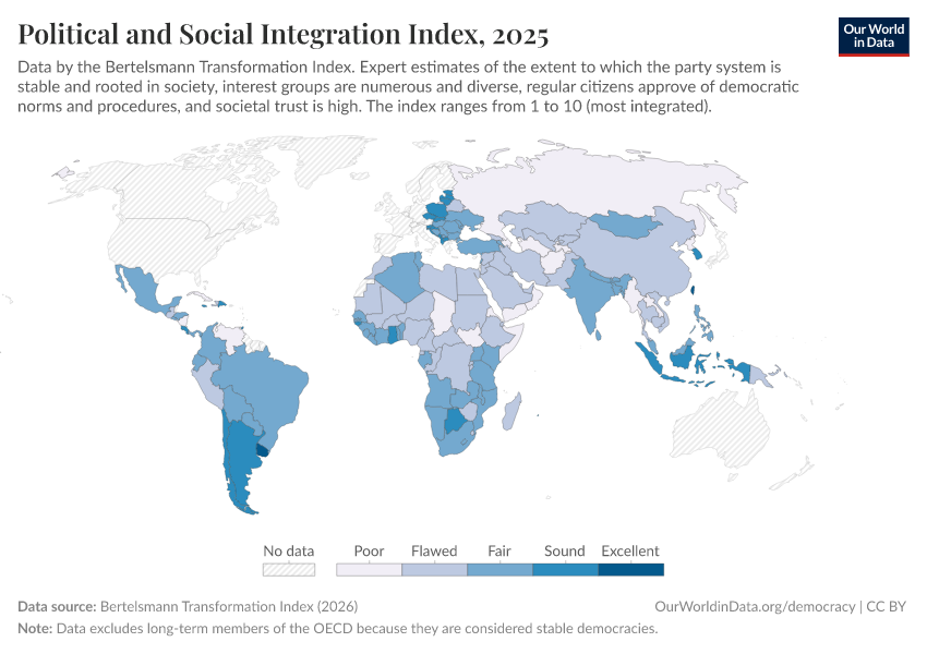 “Data Page: Political and Social Integration Index”, part of the following publication: Bastian Herre, Lucas Rodés-Guirao, and Esteban Ortiz-Ospina (2013) - “Democracy”. Data adapted from Bertelsmann Transformation Index. Retrieved from https://data-forest-share-update.owid.pages.dev:8789/20251209-133038/grapher/political-social-integration-index-bti.html [online resource] (archived on December 9, 2025).How to cite this data