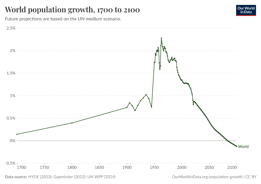 “Data Page: World population growth”, part of the following publication: Hannah Ritchie, Lucas Rodés-Guirao, Edouard Mathieu, Marcel Gerber, Esteban Ortiz-Ospina, Joe Hasell, and Max Roser (2023) - “Population Growth”. Data adapted from PBL Netherlands Environmental Assessment Agency, Gapminder, United Nations. Retrieved from https://data-forest-share-update.owid.pages.dev:8789/20250929-103213/grapher/population-growth-rate.html [online resource] (archived on September 29, 2025).How to cite this data