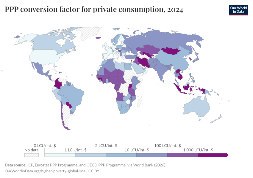 “Data Page: PPP conversion factor for private consumption”. Our World in Data (2025). Data adapted from ICP, Eurostat PPP Programme, and OECD PPP Programme, via World Bank. Retrieved from https://data-forest-share-update.owid.pages.dev:8789/20250916-102301/grapher/ppp-conversion-factor-for-private-consumption.html [online resource] (archived on September 16, 2025).How to cite this data