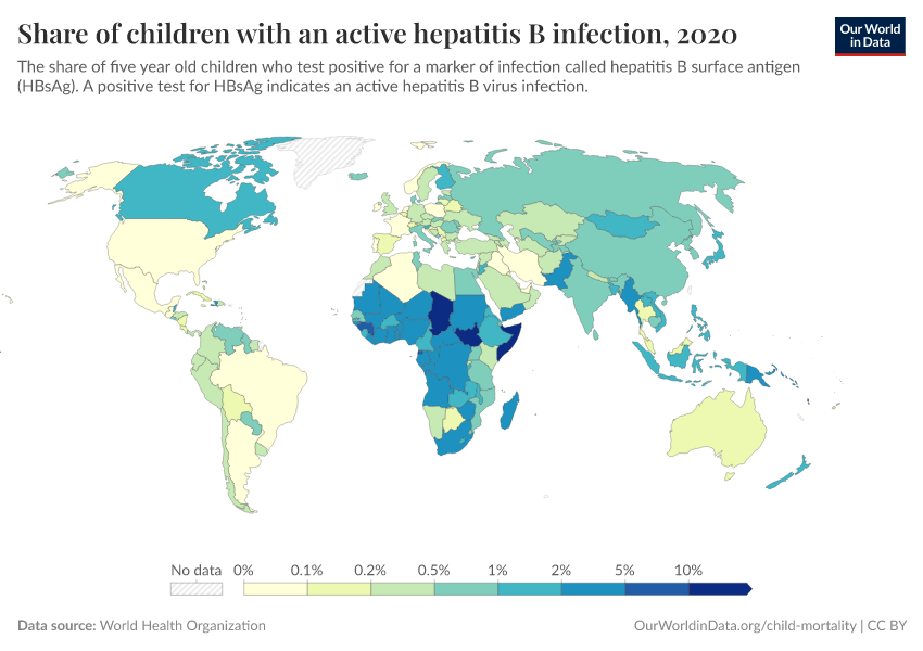 World Health Organization – processed by Our World in Data. “Share of children with an active hepatitis B infection” [dataset]. World Health Organization, “Based on serosurveys at city, subnational or national level. World Health Organisation (WHO).” [original data]. Retrieved December 29, 2025 from https://data-forest-share-update.owid.pages.dev:8789/20251125-165536/grapher/prevalence-of-hepatitis-b-surface-antigen.html (archived on November 25, 2025).