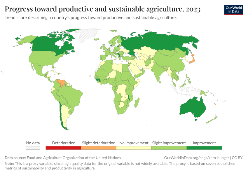 “Data Page: Progress toward productive and sustainable agriculture”. Our World in Data (2025). Data adapted from Food and Agriculture Organization of the United Nations. Retrieved from https://data-forest-share-update.owid.pages.dev:8789/20251125-165536/grapher/progress-toward-productive-and-sustainable-agriculture.html [online resource] (archived on November 25, 2025).How to cite this data