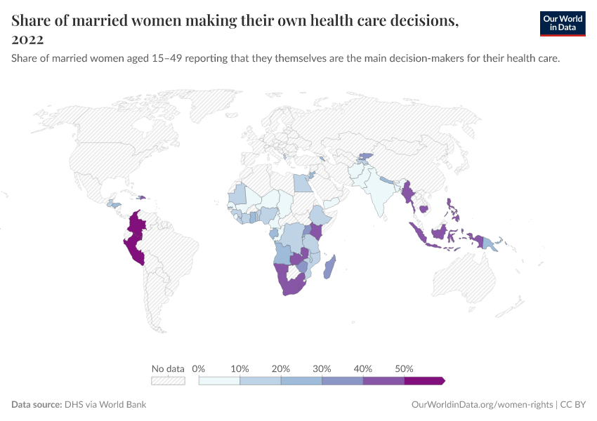DHS via World Bank – processed by Our World in Data. “Share of married women making their own health care decisions” [dataset]. World Bank Gender Statistics, “World Bank Gender Statistics” [original data]. Retrieved December 29, 2025 from https://data-forest-share-update.owid.pages.dev:8789/20250916-204433/grapher/proportion-of-women-who-make-their-own-informed-health-care-decisions.html (archived on September 16, 2025).