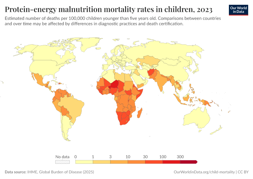 IHME, Global Burden of Disease (2024) – with minor processing by Our World in Data. “Protein-energy malnutrition mortality rates in children ” [dataset]. IHME, Global Burden of Disease, “Global Burden of Disease - Deaths and DALYs” [original data]. Retrieved December 29, 2025 from https://data-forest-share-update.owid.pages.dev:8789/20250909-093708/grapher/protein-energy-malnutrition-mortality-rates-in-children.html (archived on September 9, 2025).