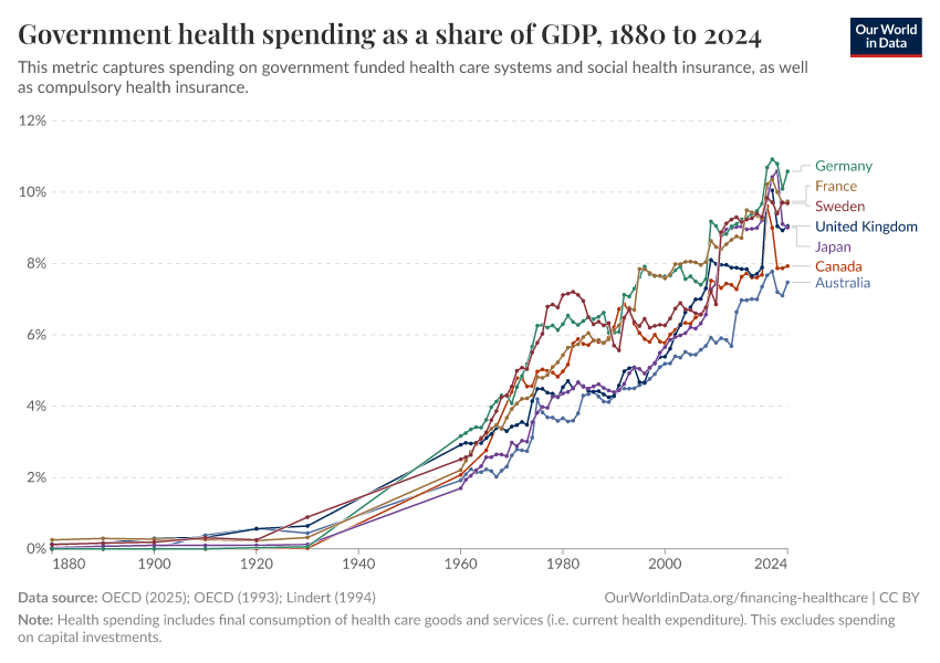 This indicator combines three different datasets: Lindert (1994), OECD (1993), and the OECD Health Expenditure and Financing Database. We combine the two OECD datasets by using the implicit growth rate from the older series, so we can extend the series back to 1960. We also use the data from Lindert (1994) to extend the series to 1880.