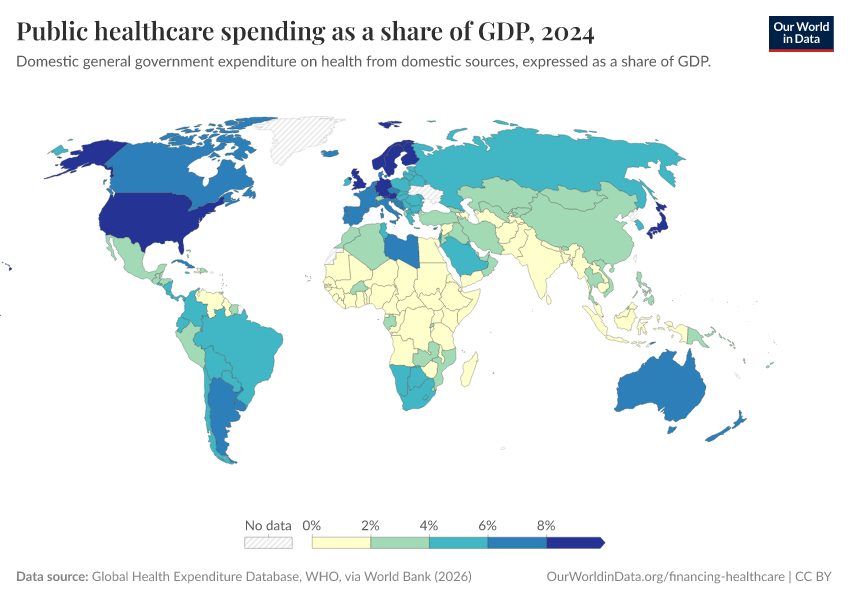 “Data Page: Public healthcare spending as a share of GDP”. Our World in Data (2025). Data adapted from World Health Organization (WHO), via World Bank. Retrieved from https://data-forest-share-update.owid.pages.dev:8789/20250916-103535/grapher/public-healthcare-spending-share-gdp.html [online resource] (archived on September 16, 2025).How to cite this data