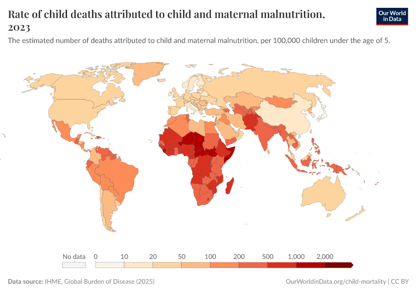 IHME, Global Burden of Disease (2024) – with minor processing by Our World in Data. “Rate of child deaths attributed to child and maternal malnutrition” [dataset]. IHME, Global Burden of Disease, “Global Burden of Disease - Risk Factors” [original data]. Retrieved December 29, 2025 from https://data-forest-share-update.owid.pages.dev:8789/20250909-093708/grapher/rate-of-child-deaths-attributed-to-child-and-maternal-malnutrition.html (archived on September 9, 2025).