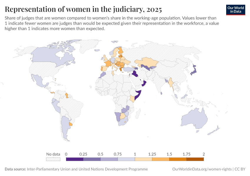 “Data Page: Representation of women in the judiciary”. Our World in Data (2025). Data adapted from Inter-Parliamentary Union and United Nations Development Programme. Retrieved from https://data-forest-share-update.owid.pages.dev:8789/20251120-211749/grapher/representation-of-women-in-the-judiciary.html [online resource] (archived on November 20, 2025).How to cite this data