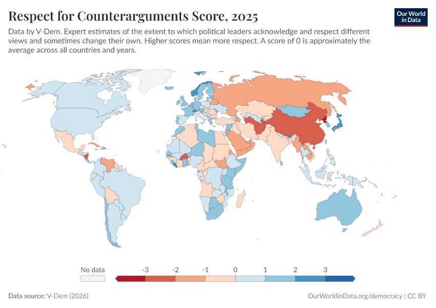 “Data Page: Respect for counterarguments”, part of the following publication: Bastian Herre, Lucas Rodés-Guirao, and Esteban Ortiz-Ospina (2013) - “Democracy”. Data adapted from V-Dem. Retrieved from https://data-forest-share-update.owid.pages.dev:8789/20250925-233948/grapher/respect-for-counterarguments-score.html [online resource] (archived on September 25, 2025).How to cite this data