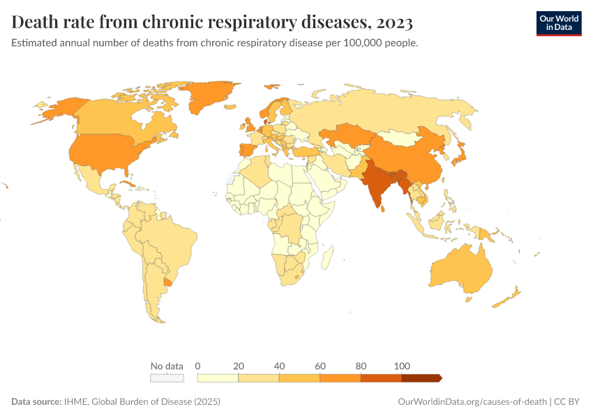 IHME, Global Burden of Disease (2024) – with minor processing by Our World in Data. “Death rate from chronic respiratory diseases” [dataset]. IHME, Global Burden of Disease, “Global Burden of Disease - Deaths and DALYs” [original data]. Retrieved December 29, 2025 from https://data-forest-share-update.owid.pages.dev:8789/20250909-093708/grapher/respiratory-disease-death-rate-gbd.html (archived on September 9, 2025).