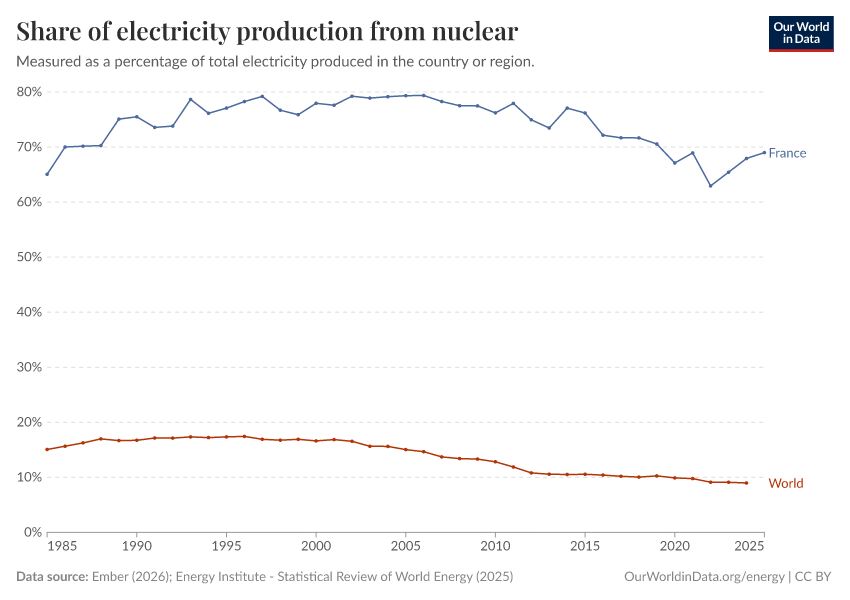 Ember (2025); Energy Institute - Statistical Review of World Energy (2025) – with major processing by Our World in Data. “Share of electricity generated by nuclear power” [dataset]. Ember, “Yearly Electricity Data Europe”; Ember, “Yearly Electricity Data”; Energy Institute, “Statistical Review of World Energy” [original data]. Retrieved December 29, 2025 from https://data-forest-share-update.owid.pages.dev:8789/20250909-093708/grapher/share-electricity-nuclear.html (archived on September 9, 2025).