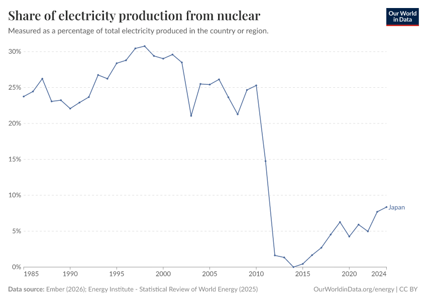 Ember (2025); Energy Institute - Statistical Review of World Energy (2025) – with major processing by Our World in Data. “Share of electricity generated by nuclear power” [dataset]. Ember, “Yearly Electricity Data Europe”; Ember, “Yearly Electricity Data”; Energy Institute, “Statistical Review of World Energy” [original data]. Retrieved December 29, 2025 from https://data-forest-share-update.owid.pages.dev:8789/20250909-093708/grapher/share-electricity-nuclear.html (archived on September 9, 2025).